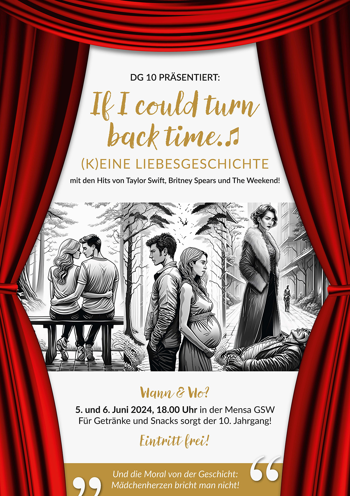 Die Reise in die Vergangenheit wird nicht nur durch Theater, sondern auch durch moderne Songs und Evergreens erzählt. Von Taylor Swifts „Bad Blood“ bis zu Elton Johns „I’m Still Standing“ – die musikalischen Darbietungen versprechen für jeden Geschmack etwas. Die gesamte Schulgemeinschaft und alle Interessierten sind herzlich eingeladen, an diesem besonderen Event teilzunehmen und die wunderbare Mischung aus Theater, Musik und Tanz zu genießen.